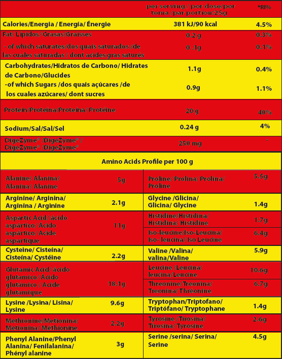 Cross-flow microfiltered whey protein isolate (from milk, instantized with sunflower lecithin), Low fat cocoa powder, Flavouring (chocolate flavour), Sodium chloride, Thickener (xanthan gum), Sweeteners (acesulfame K, sucralose), Digezyme® enzyme complex (alpha-amylase, neutral protease, cellulase, lactase, lipase).